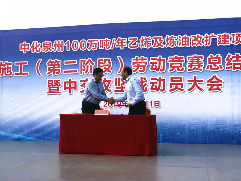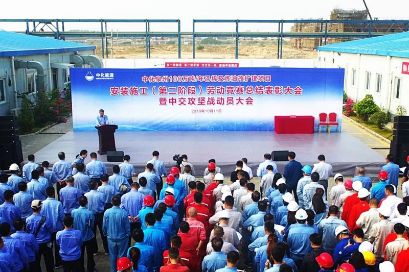 为加快推进100万吨乙烯及炼油改扩建项目建设,在实现安全、质量管控目标的前提下,确保完成年底主装置建成中交的目标,2019年10月11日上午,中化泉州乙烯项目部举办“安装施工(第二阶段)表彰大会暨中交攻坚战劳动竞赛动员大会”。会议表彰了上一阶段劳动竞赛中的先进团队及个人,并进一步动员全体干部员工、参建单位,在即将开展的中交攻坚战劳动竞赛中再接再厉。