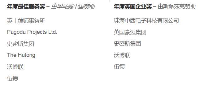 2020年9月3日晚, Wood凭借其在中国能源建设领域出色的业绩、及其全力推动两国商业合作沟通方面的卓越贡献,成功入围2020年英国商业大奖年度最佳公司和最佳服务奖两个奖项的决赛单元。