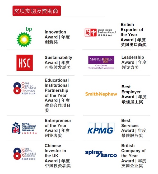创办于2008年的英国商业大奖是为了表彰为英中商业、文化交流做出杰出贡献的企业和个人而设立的,每两年举行一届。2020年度英国商业大奖由上海英国商会主办,同时得到英国国际贸易部(Department for International Trade,简称“DIT”), 英国文化教育协会(The British Council),英中贸易协会(China-Britain Business Council,简称“CBBC”),英国工商业联合会(Confederation of British Industry,简称“CBI”)以及中国英国商会,广东英国商会和中国西南英国商会的鼎力支持。