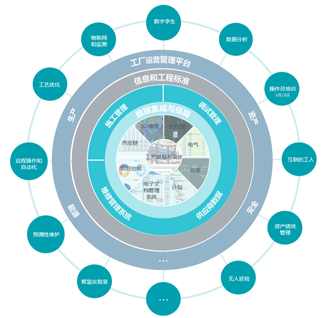通过互联设计和建设,建立工厂的物理孪生、绩效孪生、工艺孪生,辅以互联工人、全生命周期的信息管理等方法和手段,构建数字生态系统,在工厂互联运营过程中实施您的数字化战略,通过操作员仿真培训、无人巡检、人员定位、智慧实验室、预测性维护、远程操作和自动化、智能工艺优化、IoT检测等帮助工厂实现绿色、少人、安全、提效。