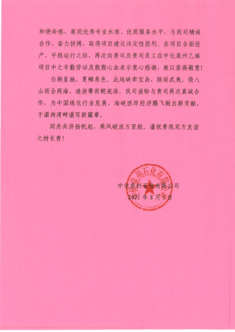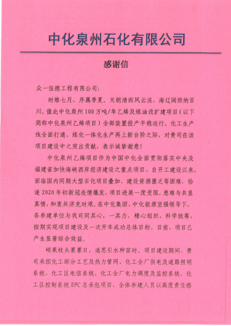 2021年8月5日, 众一伍德工程有限公司(以下“简称Wood中国”)中化泉州项目部收到一份来自中化泉州石化有限公司的感谢信。客户在信中赞扬了Wood中国项目团队在中化泉州100万吨/年乙烯及改扩建项目化工工艺及热力管网、全厂供电及道路照明等系统工程(以下简称“中化泉州乙烯项目”)实施过程中体现的卓越交付能力,并对Wood中国项目员工高度的责任心和使命感给予了充分肯定。