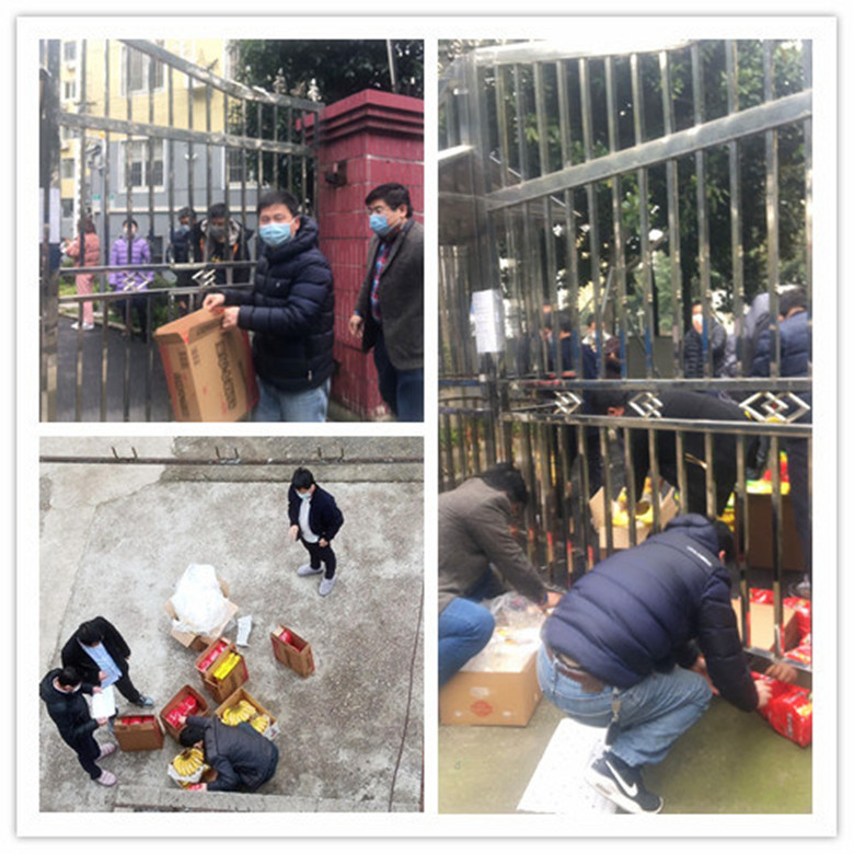 两位代表将一袋袋、一箱箱的食品、物品从大门底下塞进去,被隔离的员工从里面一样样的拿起。他们隔着大门对话,虽然戴着口罩看不到对方的脸,但一个个熟悉的声音让彼此感受到的是关怀和温暖。