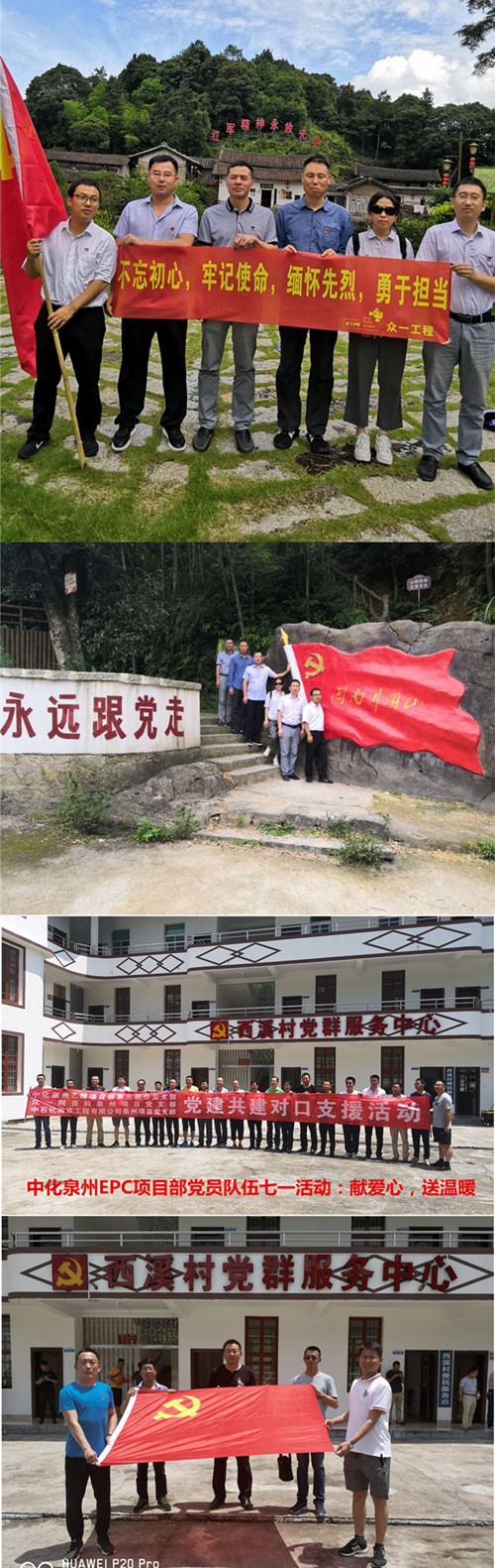 为纪念建党98周年,众阿福的党员们在各地积极组织开展党员活动,纪念党的生日。古雷石化EPC项目部党小组组织“重走长征路,重温入党誓言”活动,学习红色历史,践行党员职责。中化泉州EPC项目部党小组走进西溪村,走进群众,带去关怀,送去温暖。